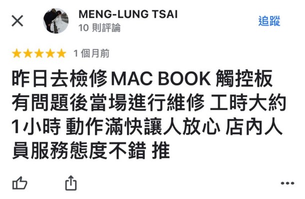 公司地址: 台北市中正區濟南路二段38-3號 聯絡電話:02-23510911 營業時間:上午11:00 - 下午9:00 信箱:repair23510911@gmail.com LINE ID:@nmf8803c FB粉絲團: https://www.facebook.com/911Apple/ MacBook換主機板